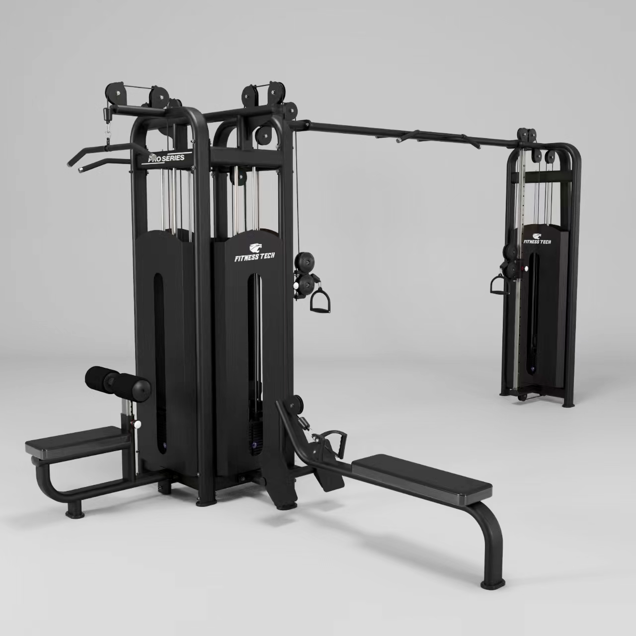 Die Maschine Multistation 5 hat einen schwarzen Rahmen mit einem gepolsterten Sitz und Rückenlehne. Es enthält fünf Gewichtsböcke mit an Seilrollen befestigten Kabeln, die für verschiedene Übungen verwendet werden können. Die Gewichtselemente sind verstellbar, sodass du den Widerstand erhöhen oder verringern kannst.
