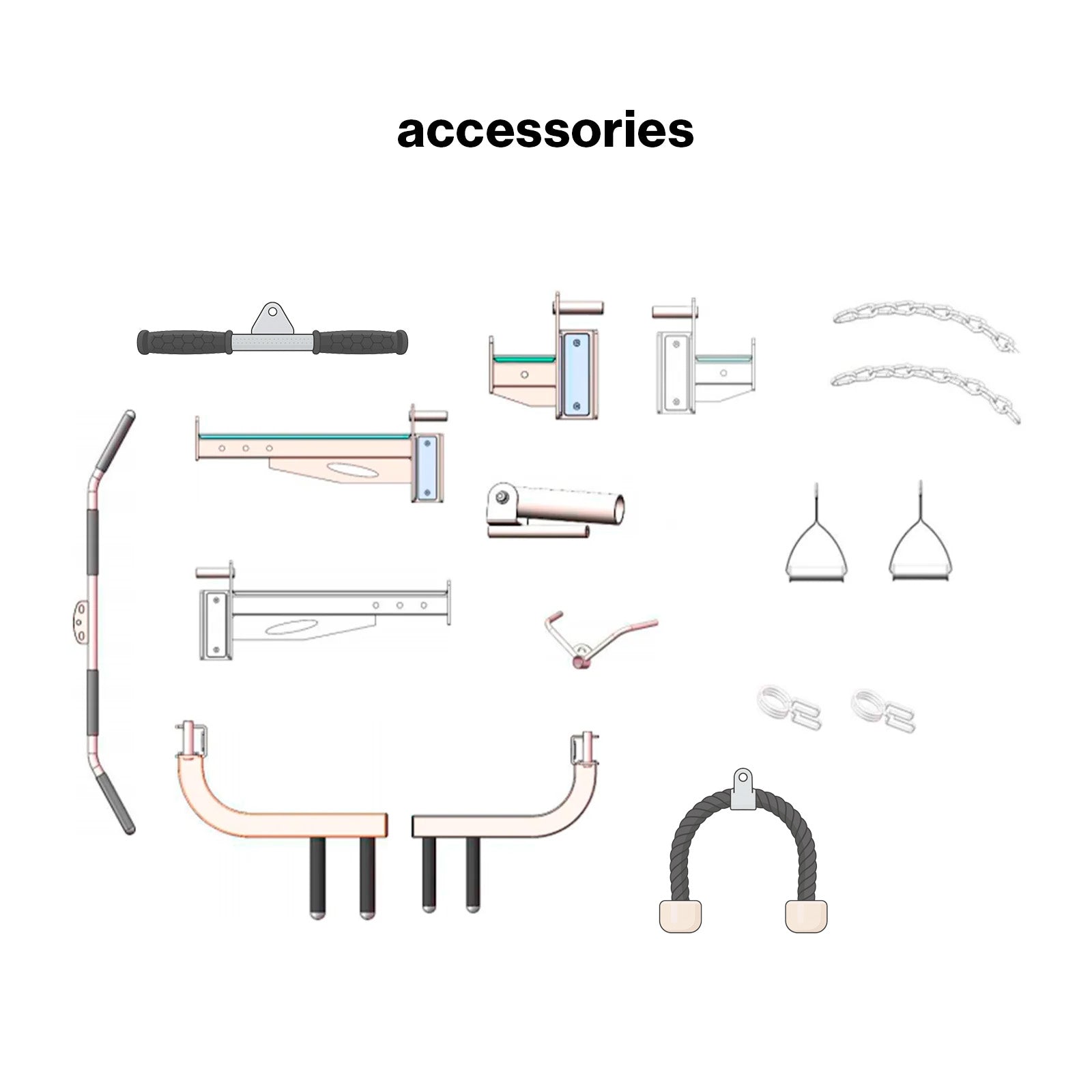 Alle in den Bildern sichtbaren Zubehörteile sind enthalten. Enthält hohe Kabelzuggriffe, gerade Bizepsgriffe und olympische Langhantelgriffe und die Durchführung von Ruderübungen.