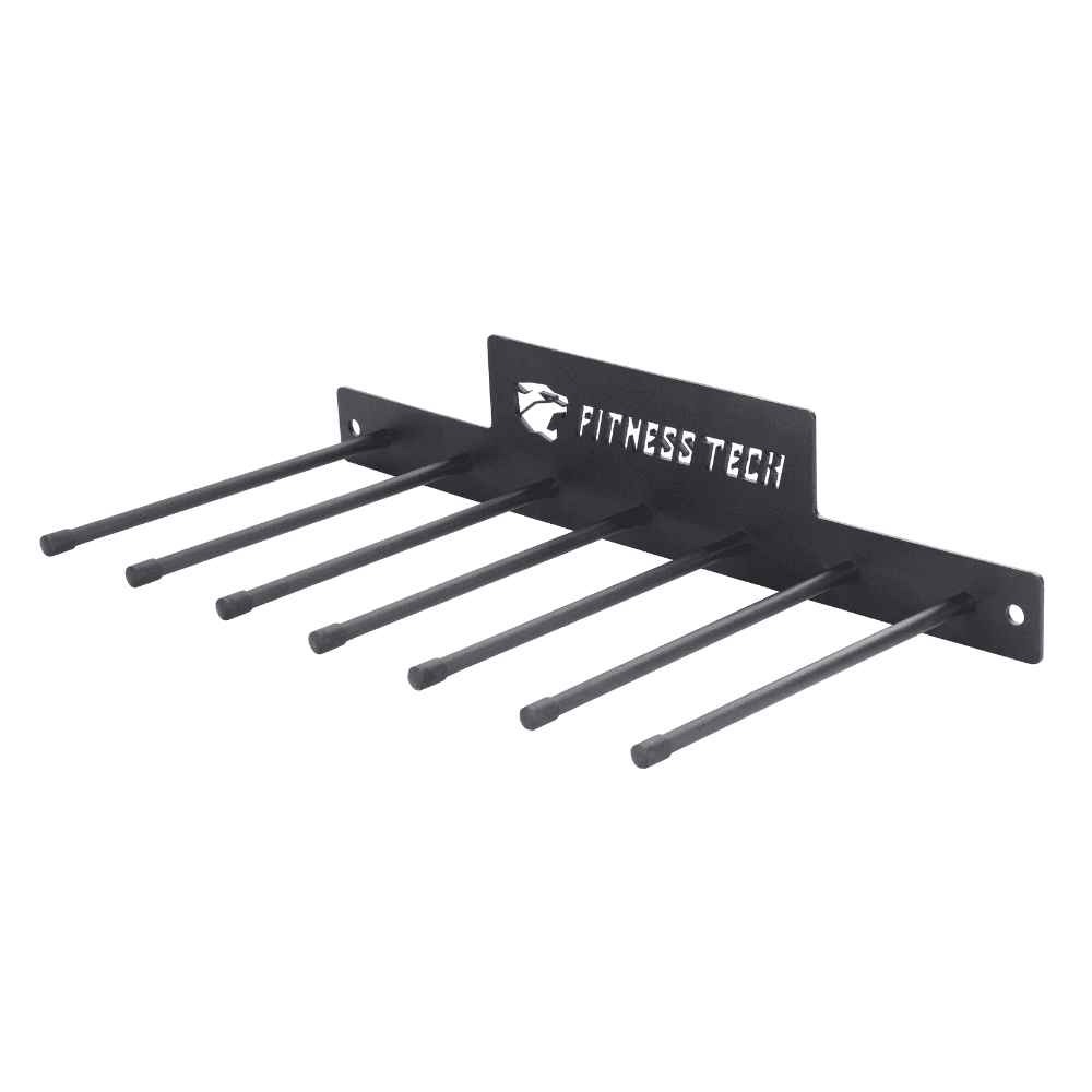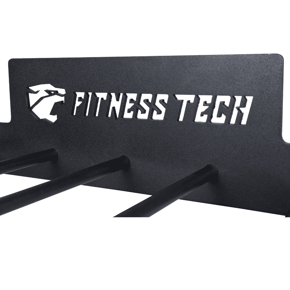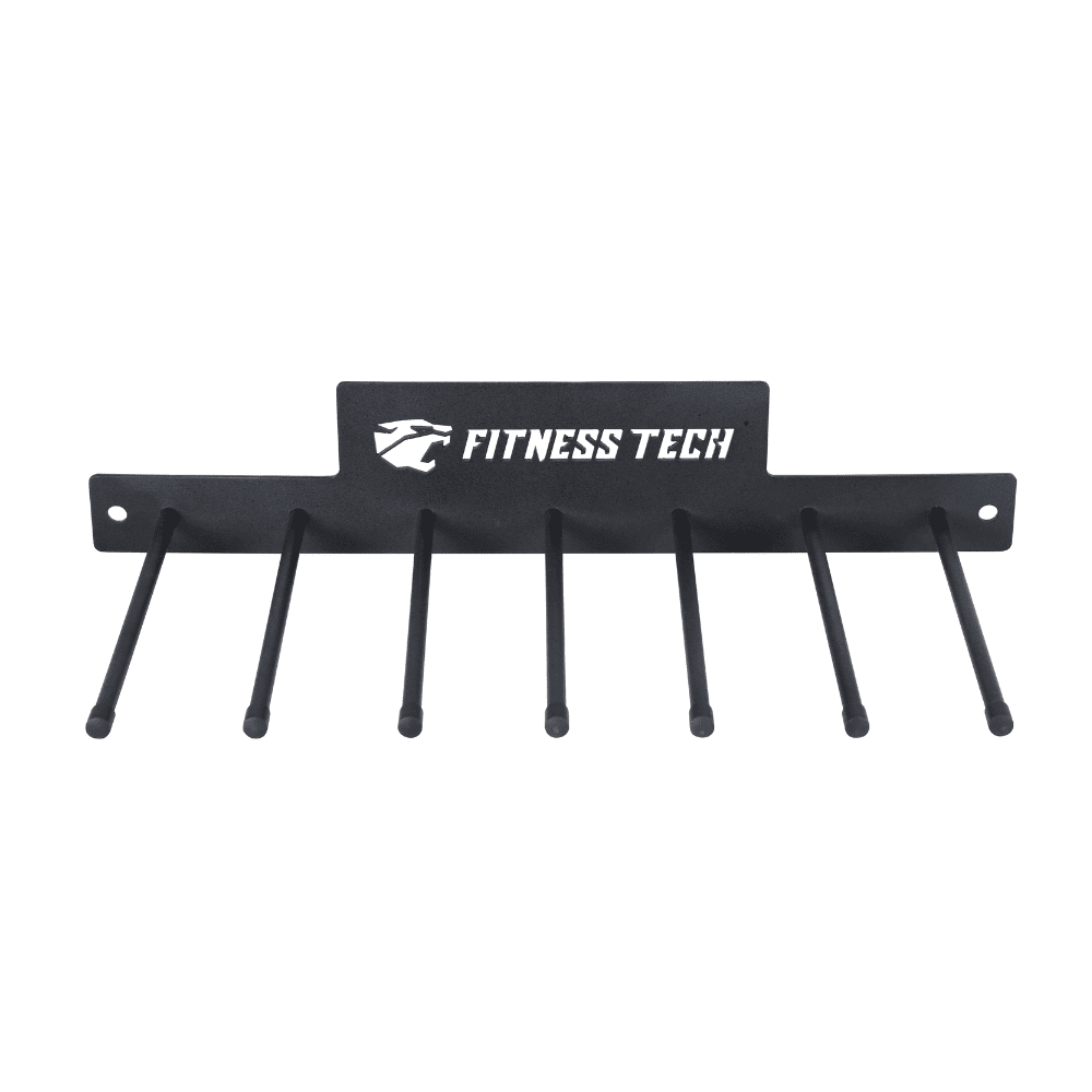 Hergestellt aus robustem Metall mit mattschwarzer Oberfläche, trägt sie das Lasergravierte Fitness Tech-Logo, das eine professionelle und langlebige Optik verleiht. Das Design ermöglicht das Aufhängen von Matten und verfügt über 7 spezielle Plätze für Widerstandsbänder, was eine praktische und vielseitige Lösung zur Aufbewahrung des am häufigsten verwendeten Materials für Mobilitäts-, Kraft- und Konditionstraining bietet.